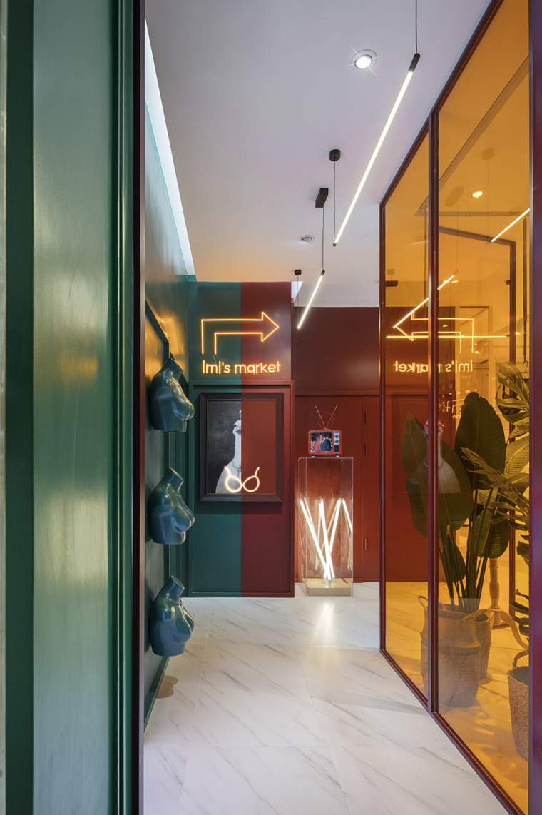將內(nèi)衣店偽裝成秀色可餐的水果店,讓人垂涎欲滴,整體色調(diào)偏暗,通過霓虹燈管的照射,裝飾畫的鋪墊,營造一種電影特效大片的感覺。設計師加入橘黃色的亞克力片很好的中和了整體色調(diào),空間層次感十足,綠植盆栽的裝飾為空間增加些許生機。