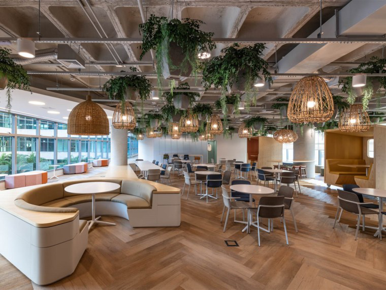 這家旅行社給人的第一印象是不是感覺生態(tài)氣息十足呢?接待室采用淺色系的木質(zhì)地板進行鋪設而成,木質(zhì)地板更貼合原生態(tài),也符合旅行社的主題設計。頂面保留原始的建筑結構,在搭配懸掛的綠植,給人身臨其境的美感,木質(zhì)燈框像一個鳥籠一樣包含在內(nèi),就像是回到了原始森林。