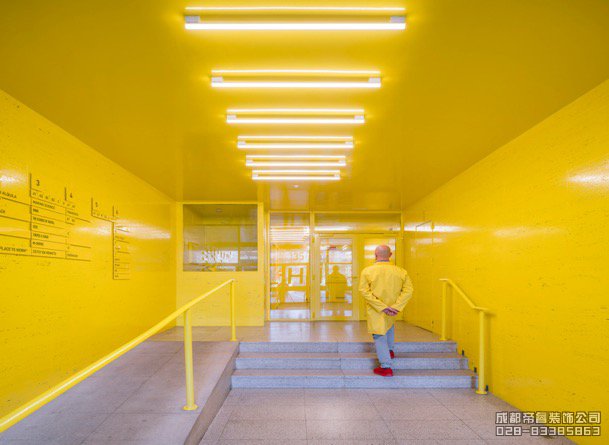 將過(guò)道的頂面墻面全部涂成黃色,給人帶來(lái)另一種視覺(jué)效果。醒目的黃色使得空間更加跳躍,具有引導(dǎo)作用。頂面簡(jiǎn)單的LED燈具很好的為空間提供照明,也不會(huì)給人繁雜的感覺(jué)。
